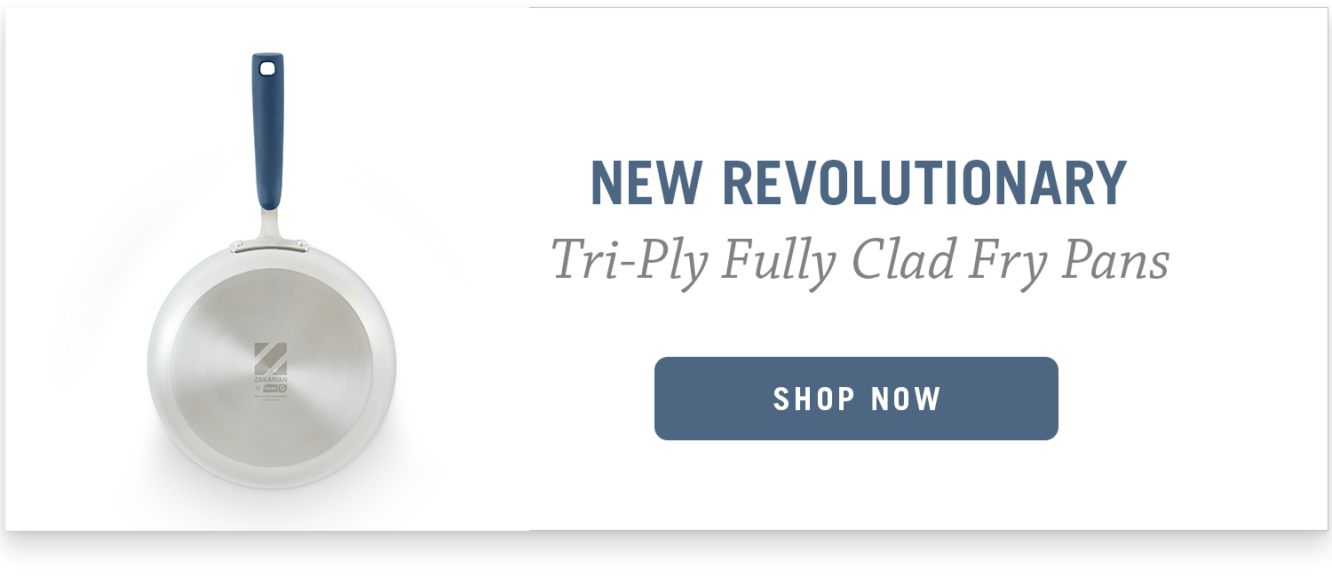 We are thrilled to announce the launch of our new Tri-Ply Fully Clad Fry Pan Set. After years of listening to feedback and testing, we have created the perfect steel cookware for home use and storage. This break-through fry pan set combines all the performance needs of pro chefs with the ease and convenience desired by home cooks.Learn More.